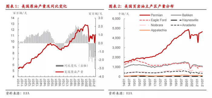 新冠疫情前,产出效率提升和每年超过200亿美元的资本投入是驱动2017-2019年美国原油产量创新高的两个重要因素,但从2019年下半年开始,美国产量增速逐渐下降,产出效率出现瓶颈。此后新冠疫情爆发和油价暴跌,美国原油产量也因此大幅下降,2020年下半年后随着油价回升,因经济性关停的油井重启,美国原油产量虽有反弹,但始终没有回升到疫情前水平,较疫情前偏低200万桶/天左右。我们认为此前美国增产的两个驱动力,产出效率和资本支出都面临约束是制约美国原油供应的恢复的主要原因。展望未来,这两个因素的变化也将左右美国供应恢复前景。