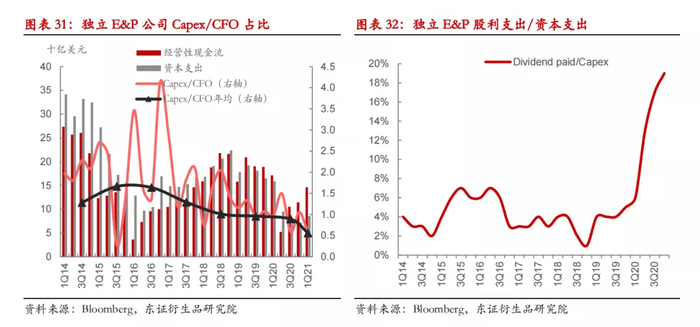 资本纪律体现在E&P公司在最近四个季度的资本支出占经营性现金流的比例大幅下降至62%,2015和2016年Capex/CFO能够达到160%。部分大型E&P企业提出可变派息机制,额外的现金流被回馈给投资者而不是用于新项目投资,股息支出同步上升,E&P派息规模从2018年开始持续上升,股利支出占资本支出的比例在2020年四季度上升至18%。在一个更加追求成熟市场中,资本支出纪律和股息返还应成为取得优异业绩的关键。