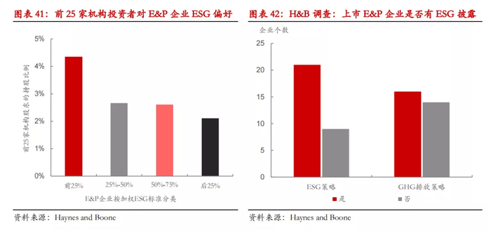 E&P企业面临资本约束的另一个原因在于行业政策风险不断上升,全球范围内正在进行中的能源转型和美国拜登政府上任后推行的“绿色新政”都使得投资者对于传统油气行业未来的投资回报产生疑虑,也加剧了E&P企业的资本成本。投资者对生产商的ESG披露要求相应上升,特别是涉及到环境部分,Haynes and Boone对30家上市E&P企业(市值超过1亿美元,无破产风险)调查发现,越来越多的上市公司为迎合市场主流导向和投资者要求增加ESG披露,70%已经包括ESG策略,一半将“温室气体”排放标准列入经营策略中。同时,调查也显示ESG披露较完整的企业在资本市场获得了更多的青睐,25家主流机构投资者对ESG标准较高的E&P企业投资比例明显高于同类其他企业。