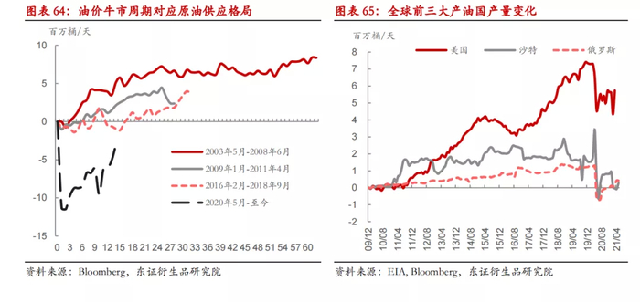 在资本约束的新常态下,未来美国供应预计不会重现过去激增的趋势,转而变成缓慢回升的趋势,这将使得美国供给弹性下降。回顾过往油价上涨长周期,供给弹性往往不足,即油价上涨无法刺激供给快速释放而形成了较大的供需缺口。2010年之后,美国供应惊人的供给弹性曾经是抑制油价长周期上涨的重要因素。2011年开始技术革命使得页岩油产量突飞猛进,实现第一个五年400万桶/天的增长,2016年之后,依靠资本的力量,又在三年时间里实现了第二个400万桶/天的增长。页岩油行业进入“现金流时代”,美国供给弹性下降对于全球供应端来说是一个重大的改变,对油价中长期中枢形成支撑。