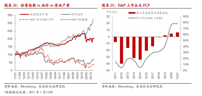 除了经营性现金流外,资本市场债权融资是生产商普遍预期未来一年的主要资本来源,这一趋势从2019年开始延续至今,由于利率水平较低,E&P公司高收益债券发行规模在2021年前两个季度创下近5年新高,而股权融资规模在2016年之后逐年下降。发债融资是生产商主要的融资手段之一,长期债务压力对企业现金流要求较高。目前股票和债券市场对于“资本纪律”的反应是正面的,2020年下半年以来能源股表现强于大盘,美国独立油气生产商高收益债券收益率创新低,但同时市场对于出现重回扩张倾向的企业也反应剧烈,例如最大的独立页岩油商EOG在表示将2022年公司产量增速目标上调至12%时,第二天股价就下跌8.5%。页岩油过往的“劣迹”使得市场始终心存疑虑,金融市场变相的监督加强了生产商遵守资本纪律的约束力。在全球能源转型的大背景下,资本约束成为全球性的趋势,上市E&P公司投资占经营性现金流的比例在经历每一次油价熊市后均显著下降,产生稳定的自由现金流,改善资产负债表,同时保持相对合理的产量增长可能是未来E&P企业的经营范式。