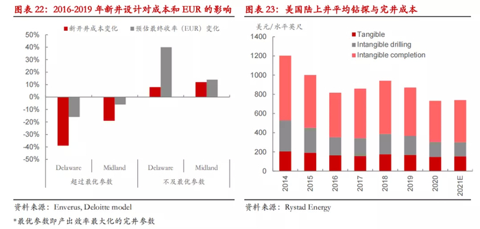 2016年至2019年Permian新井数据显示超过最优参数的新井成本下降的程度要远远超过预估最终收率(EUR)的下降,相对应的是生产商在Permian地区实际新开井中仅有33%左右的新井将完井参数设定是在产出效率最大化的区间内,有43%的油井将完井参数设定在超过最优区间,这表明生产商试图通过牺牲一部分产出效率的方式实现降低单井成本,毕竟配合大量的完井,仍然能够保证产量的增长。
