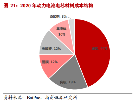 这里再简单介绍下,动力锂电池由正极、负极、隔膜和电解液构成,成本占比分别为44%、19%、12%、12%左右。