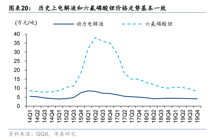 在新型锂盐LIFSI被广泛使用前,六氟依然是电解液的核心材料,二者的价格走势基本一致。