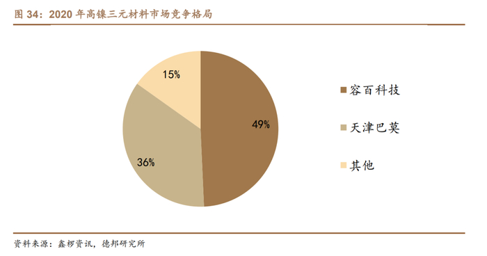 巴莫是国内高镍正极龙头,高镍领域市占率位居国内第二,2020年市占率36%,仅次于容百科技;而在2021Q1,三元正极市占率上,巴莫超过容百排名第一。