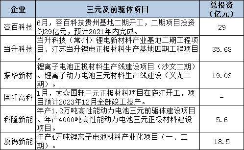 2021年以来,包括容百科技、当升科技、振华新材、科隆新能、厦钨新能等三元正极材料企业扩产规划、项目开工均提上日程,项目总投资合计近108亿元。
