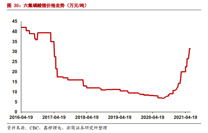 电解液的核心材料六氟磷酸锂(六氟),占电解液成本比重高达50%,自去年三季度后价格一路飙涨,报价从底部8万元/吨升至35万元/吨,创下近4年新高,涨价速度就跟坐火箭一样。
