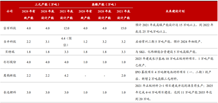 目前各大材料企业都在积极布局高镍产能,2021年底产能释放后,正极的竞争格局也会发生改变。