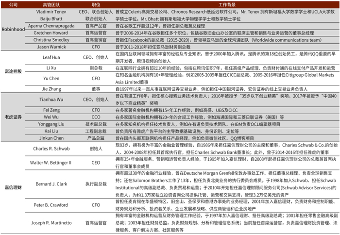 各网络券商自成立之日起,不同的基因决定了产品设计及用户体验的差异,与传统金融公司的零售金融服务更是存在底层的代际差异。以Robinhood为例,公司创始人及主要管理层团队包括来自于Facebook、Google、Amazon等互联网公司的核心成员,公司自成立之初即秉持“彻底金融民主化”的理念(Our mission is to democratize finance for all)、坚持对客户都一视同仁(We are all investors)。同时,以富途为例,公司管理层和技术团队大多来自腾讯系,其创始人李华是腾讯18号员工、腾讯视频创始人,首席技术官曾是腾讯QQ后端服务负责人、领导QQ多个系统重组项目,强大的技术背景及深厚的互联网基因使得公司在产品迭代的频次、系统运营的效率、用户对产品&服务的体验等方面有着较高的追求。因此,Robinhood基于对金融民主化/投资自由化的追求,使得公司的产品设计更加简洁明了、直观可视化、高度游戏化且具有创意感;而富途来自腾讯系的基因,使得公司的产品全面完善,集交易、行情、资讯、社区、理财于一体,更适合于有一定自我投资意识和能力的大众零售及富裕人群。