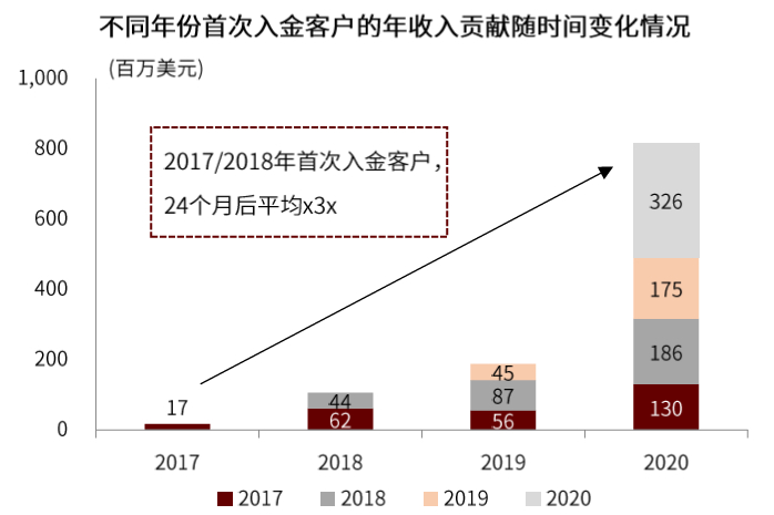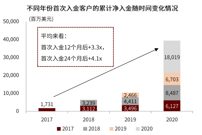 金融业务的高单客价值叠加基于品牌/产品/流量的高效/低成本的互联网获客方式,共同打造了优质UE模型。我们通过拆解各网络券商的盈利模型,总结领先网络券商优质Unit Economics背后的驱动因素,对比来看:1)富途:我们测算2020年单客收入~779美元(经调整为剔除利息支出后的净收入口径)、远高于同业,单客成本~417美元、其中存量付费客户单位获客成本~96美元(新增付费客户单位获客成本~156美元),单客利润达340美元、高于同业,对应调整后净利润率同比+25ppt至44%、1Q21进一步提升至58%,或反映了公司在高度可延展的商业模式下,通过不断拓展市场和产品类别实现单客收入及盈利能力的可持续扩张。2)东方财富:我们测算2020年单客收入~78美元(~550元),单客成本~26美元(~180元)、其中存量付费客户单位获客成本~5美元(~35元)、相对较低,单客利润达~45美元(~320元)、相对较高,对应净利润率同比+15ppt至58%、1Q21进一步提升至66%,或反映了公司从互联网平台切入金融业务所积累的强大品牌效应、流量优势及领先的规模效应,带动公司利润率相较同业更高。3)Robinhood:根据招股书披露数据,我们计算得2020年单客收入、单客利润相较同业更低,或部分反映了公司更为庞大且高速增长的付费客户基础以及相对单一的变现模式;若考虑客户入金的时间效应(Cohort),根据招股书披露,公司单客月均累计净入金规模在12个月/24个月后分别提升3.3x/4.1x、带动单客收入24个月后提升至3x。与此同时,新获客的平均成本回收期(revenue payback)从2019年的~13个月下降至2020年的不到5个月,或反映了公司更为高效的新增获客及存量客户愈发显著的贡献。