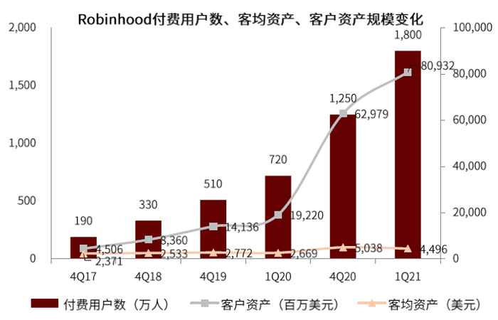图表:Robinhood客户数的高速增长驱动客户资产规模快速提升