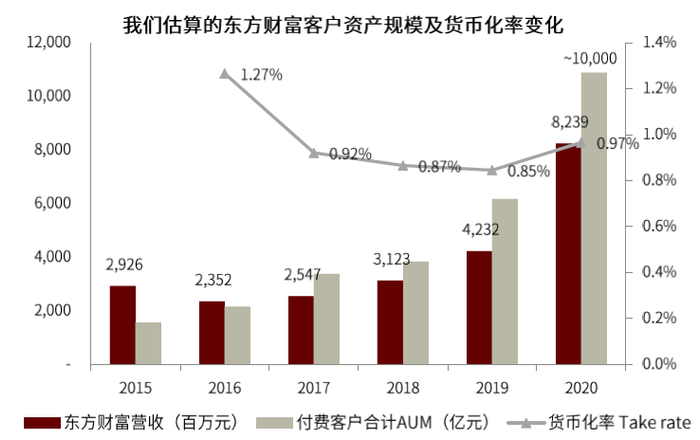 注:1)东财付费客户数及客户AUM均基于我们估算,付费客户合计AUM=天天基金AUM+券商AUM,其中,天天基金AUM基于我们测算、券商AUM基于证券业协会披露的“证券托管市值+客户资金余额”;2)货币化率Take rate基于期初期末平均客户AUM测算