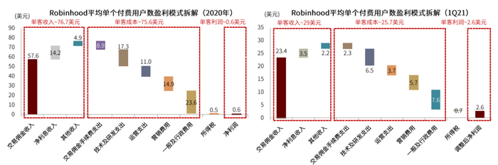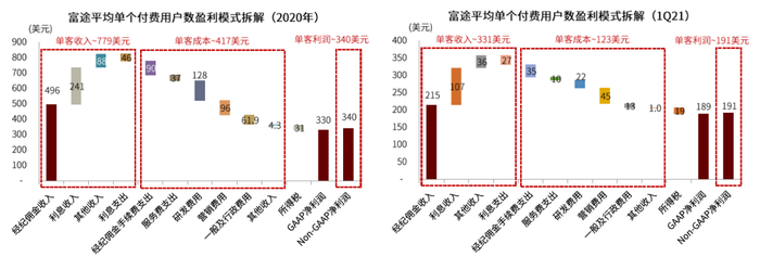 注:1)分母基于2020年末及1Q21末的期末付费用户数计算、1Q21未年化;2)单客收入剔除了利息支出、但未剔除经纪佣金手续费支出;3)1Q21单客成本未包括一次性费用14.9亿美元、故净利润为调整后口径