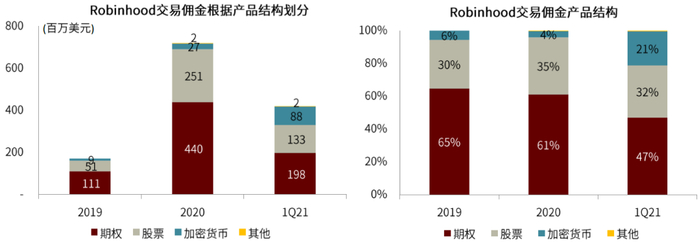 图表:Robinhood期权衍生品交易活跃,加密货币新兴资产交易佣金收入占比有所提升