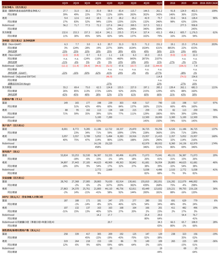 过去两年,流动性宽松下的资本市场活跃提升、新经济企业批量上市、美国市场投资民主化等趋势下,新兴互联网券商迎来了爆发式增长。1)富途:1Q21付费用户数同比+231%/环比+53%至79万人,带动客户资产环比+62%至4,622亿港币(vs.1Q19仅623亿港币),总收入同比+349%/环比+86%至22.05亿港币;2)老虎:1Q21付费用户数同比+180%/环比+45%至37.6万人,带动客户资产同比+290%/环比34%至214亿美元(vs.1Q19仅31亿美元),净收入同比+246%/环比+77%至7,574万美元;3)Robinhood:1Q21付费用户数同比+150%/环比+44%至~1,800万人,带动客户资产同比+321%/环比+29%至809亿美元(vs.2019年末141亿美元),净收入同比+309%/环比+64%至5.2亿美元;4)东方财富:1Q21营收同比+71%/环比+26%至28.9亿元、净利润同比+119%/环比+38%至19.1亿元。