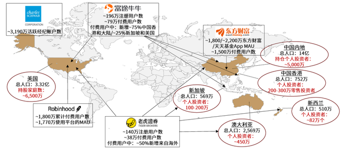 注:1)东财用户数基于我们估算、截至2020年末,其余公司用户数据截至1Q21末;2)美国/中国香港数据截至2019年末,其余国家和地区数据截至2020年末