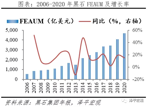 黑石集团从创立至今35年,管理资产总额从最初的40万美元增长至2020年达到6185.6亿美元。1995-2007年间AUM复合增长率(CAGR)高达33.8%,2008-2020年间AUM复合增长率趋缓,为16.9%;FEAUM从2006年的548亿美元增长至2020年的 4694.3亿美元,2015年后FEAUM的增长趋于稳定,CAGR为13.8%。