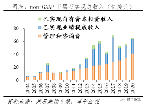 黑石的总盈利能力与其他大型上市另类资管公司相比处于中游,2019年黑石ROE达到峰值为31%,净利润率分别为28%;2020年黑石ROE和净利润率分别为15%、17%,同期KKR最高,为16%、43%,最低阿波罗为7%、10%。黑石采取轻资产运作,首创门槛收益标准,管理咨询费贡献63%的业务收入。2004-2020年non-GAAP下业务总收入从5.38亿美元增长至65.15亿美元,CAGR为11.8%。2020年的收入构成中,管理咨询费占比63%,业绩提成34%,自有资本投资收入仅占2.4%。黑石是市场上首个采取门槛收益(hurdle rate)标准的另类资管机构,设定门槛收益为5%-8%,仅当基金总收益超过门槛收益时,GP才能确认超额业绩收益,以此维护投资者利益,笼络更多机构资金。
