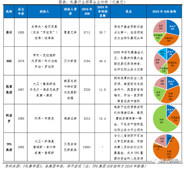 横向对比5家全球知名私募股权基金的成立背景和业务优势。1)黑石集团:是目前全球规模最大的私募股权投资机构,在房地产板块的AUM占比29%,远超过同业其他公司的布局。2)凯雷集团:创始人有政府供职背景,有丰富的人脉资源,业务结构上凯雷集团FOF的AUM占比达到20%,是其特色板块。3)KKR:首创现代PE基金的商业模式和行业标准,后凭借垃圾债券融资引领杠杆收购潮流,大型收购交易纪录的保持者,截至2019年AUM为2184亿美元,仅为黑石的38%,但净利润高达46.4亿美元,是黑石的1.2倍,盈利能力十分突出,传统PE股权投资是最主要的业务板块。4)阿波罗:阿波罗起家于垃圾债券的首创机构德崇证券,私募信贷为其特色板块;5)TPG集团:TPG集团管理创始人大卫·邦德曼曾供职于石油大亨巴斯家族,巴斯集团成员离开后创建了一批卓越的私募机构,业务板块以私募股权为主。