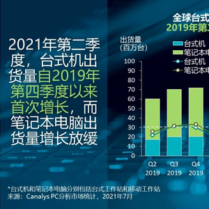 据 Canalys 的最新数据显示,2021年第二季度全球PC市场继续保持增长势头,台式机和笔记本电脑(包括工作站)的出货量同比增长 13%,达到8230万台。市场需求依然旺盛,特别是在商用领域,而新冠疫情促使消费者购买PC的紧迫性则开始削弱。部件供应问题仍然是该行业面临的一大挑战,但订单不足和积压的程度在减小。笔记本电脑和移动工作站的出货量同比猛增 15%,达到6670万台,而台式机和台式工作站的出货量同比增长6%,达到1560万台。