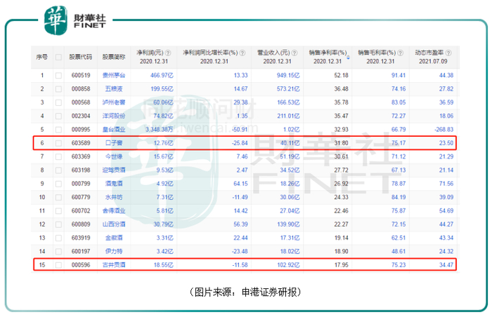 可以发现,口子窖的营收不足古井贡酒的一半,其净利润则达到了后者的三分之二,在销售毛利率差不多的情况下,口子窖的销售净利率接近后者的两倍。