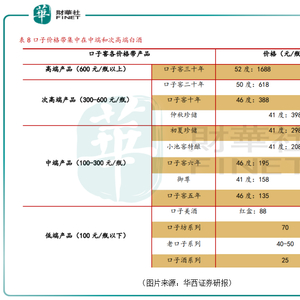 口子窖主力产品为口子窖系列,主销产品仍以5年、6年为主,集中在100-300元价格带。同时,产品系列中,缺乏高端系列产品,虽推出30年、周年纪念版等高价产品,但产品上量缓慢,价格带跃升困难。