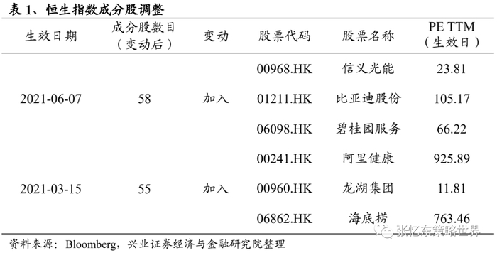 1)通过计算公式可以看出,成分股调整对于指数EPS计算的影响密不可分,而今年以来,恒指进行了重大的编制规则修改。直观的理解,当新的公司加入指数时,指数公司会进行技术性处理使得指数保持平滑,而如果新加入的公司PE更高,那么计算出的EPS就会变低。