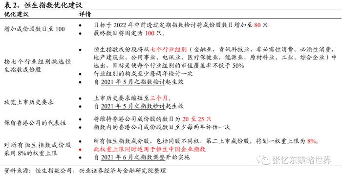 恒指后续还会进行大的调整,在2022年中前股份数目增加至80只。因此,我们还将看到计算的恒指预测EPS的不断“下调”,但是这并不表示恒指盈利真的下降了。2021年3月1日,为确保恒生指数持续成为香港市场最具代表性和最重要的市场基准,恒生指数公司公布有关恒生指数的优化细节,对恒生指数实施以下五方面系统性优化:1)扩大市场覆盖率;2)扩充七大行业代表性;3)迅速纳入新上市新股;4)保留香港公司代表性;5)改善成份股权重分布。上述变动于2021年5月份之指数检讨开始实施,并于2021年6月份之指数调整中生效。