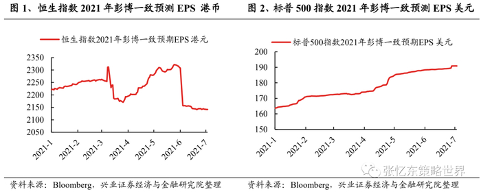 1.1、2021年,恒指预测EPS增速被下调了吗?根据一致预期,截至2021年7月14日,恒生指数2021年预测EPS同比增速为9.4%;而同期标普500指数预测EPS同比增速为55.3%,恒生指数预测增速远低于标普500指数。除此之外,细致拆分2021年预测EPS走势,可以发现在3月15日、6月7日附近,预测EPS均发生了断崖式下跌。