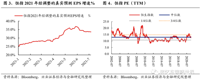 2.1、高增长,低估值,港股性价比凸显。根据EPS计算公式,我们对成分股调整前后2020年底的恒指EPS进行追溯调整,计算得到截至7月14日,2021年恒指一致预测EPS增速为33.5%,恒指2021动态估值仅为12.9倍。
