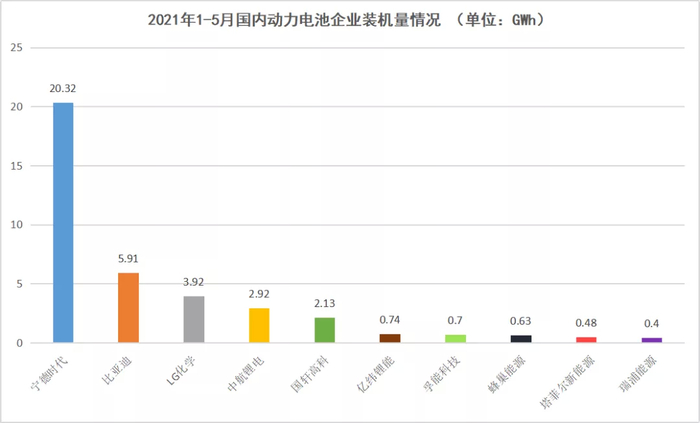 据中国汽车动力电池产业创新联盟统计数据显示,今年1-5月国内动力电池企业装机量排名中,宁德时代以20.32GWh排名第一,比亚迪和LG化学分别以5.91GWh和3.92GWh分列二三位。
