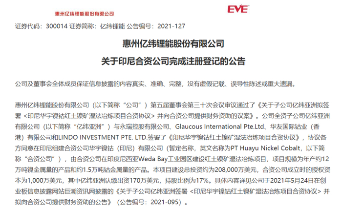 今年5月底,亿纬锂能联合华友钴业在印尼投资建设了红土镍矿湿法冶炼项目并成立公司,按照计划这一项目年产约12万吨镍金属量和约1.5万吨钴金属量的产品,总投资约20.8亿美元。