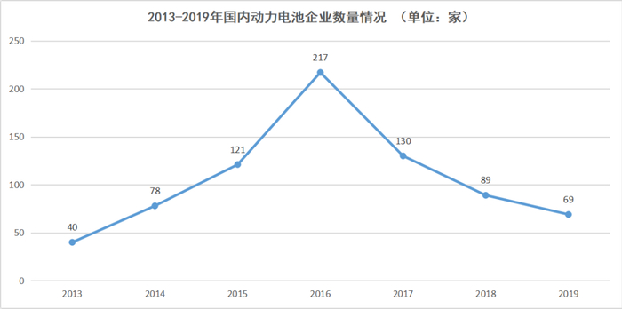 受此影响,国内动力电池行业中企业的数量也从2016年的217家,迅速跌落至2019年的69家。