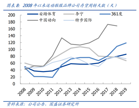 当时包括鸿星尔克在内的企业都对市场盲目乐观,忙不迭地扩张导致了行业的高库存。根据国盛证券报告,从2010年开始我国运动鞋服品牌的存货周转天数显著上升。