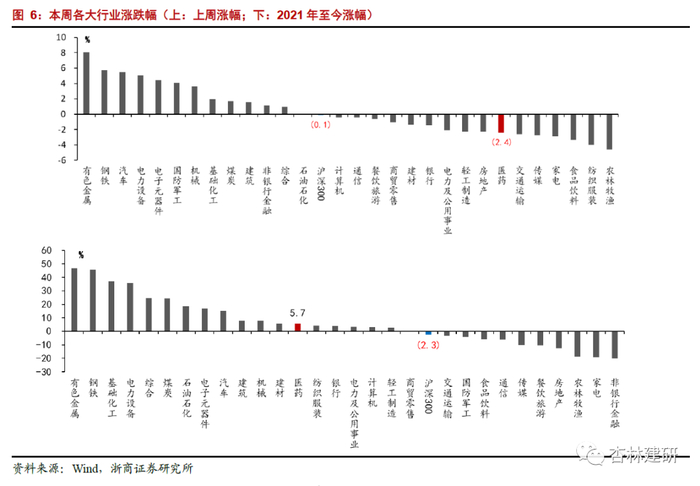 本周医药板块下跌2.39%,跑输沪深300指数2.28个百分点,在所有行业中跌幅较为明显。2021年初以来,医药板块上涨5.7%,跑赢沪深300指数8.1pct。