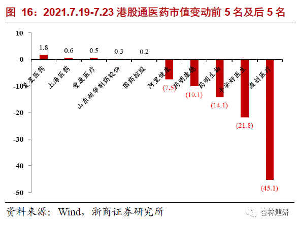 具体持仓标的上,2021年7月19日至7月23日陆港通医药标的陆港通持股市值增长前5名分别为华大基因、泰康生物、恩华药业、老百姓和康龙化成,市值下降前5名分别为迈瑞医疗、爱尔眼科、泰格医药、智飞生物和药明康德。港股通医药标的市值变动前5名分别为复星医药、上海医药、爱康医疗、山东新华制药股份和国药控股,后5名分别为微创医疗、平安好医生、药明生物、药明康德和阿里健康。