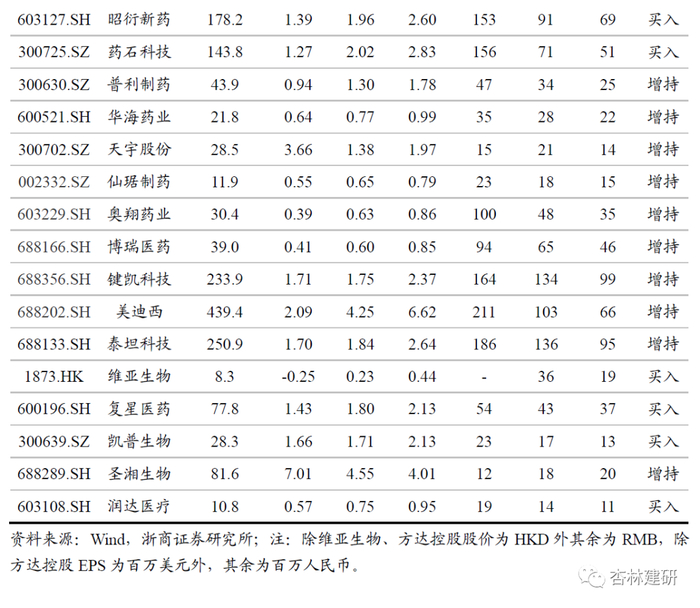 具体结合公司质地和估值情况,我们重点推荐:药明康德(02359)、泰格医药(03347)、方达控股(01521)、阿拉丁、普洛药业、健友股份、普利制药、九洲药业、博腾股份等。