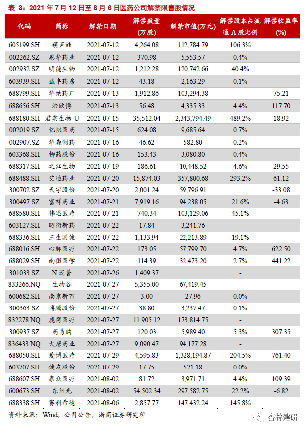 近一个月来限售股解禁及股权质押情况变化:关注基本面因素外可能影响股价流动性和交易配置的因素。2021年7月5日至7月30日,共有31家医药上市公司发生或即将发生限售股解禁,其中君实生物、艾迪药业、爱博医疗、赛科希德、葫芦娃等公司涉及解禁股份占流通股本比例较高。在股权质押方面,海思科等公司第一大股东股权质押比例有所上升,量子生物、金城医药、天宇股份等公司第一大股东股权质押比例下降。