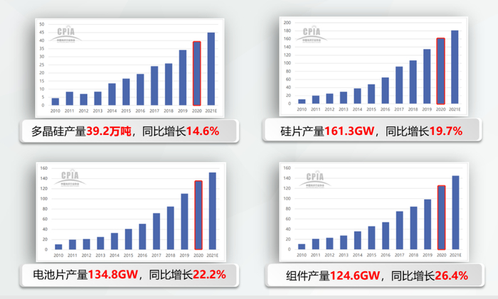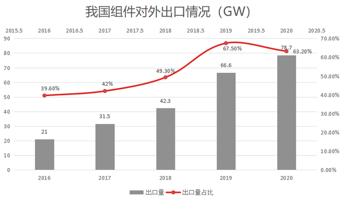 在全球光伏市场表现也是韧性十足,全球新增装机持续上涨,2020年受到疫情影响,但是全球光伏市场仍然保持了增长势头,主要得益于中国光伏市场表现出的恢复性增长。另外我国组件出口量继续攀升,组件出口量在国内产量中的占比依然保持高位,充分体现了海外国家队光伏发电不断增长的需求。