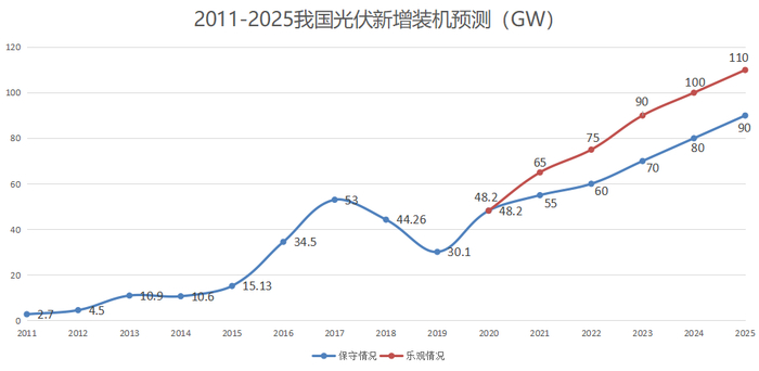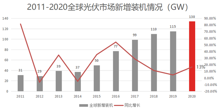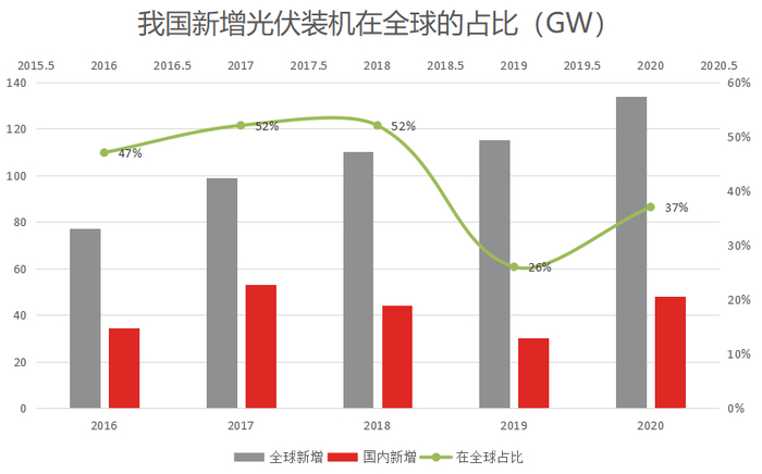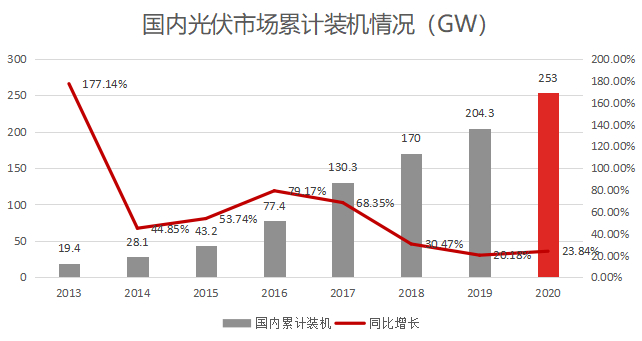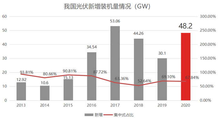 2020年我国光伏新增装机规模是48.2GW。光伏新增装机规模同比增幅67%,光伏累计装机规模253GW,年光伏发电量2605亿kWh,光伏发电量同比增幅16.2%,光伏发电占总发电量比重的3.5%。