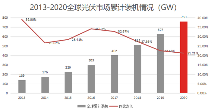 全球光伏发展看中国,中国光伏市场在全球的占比为1/3,2013-2020全球光伏累计装机量的CAGR为27.5%,同期中国光伏累计装机量的CAGR为44.3%,中国光伏市场的增速高于全球增速。