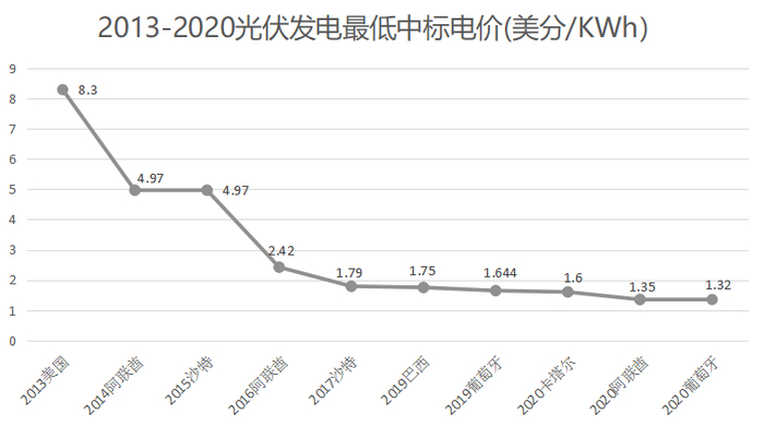 全球范围内中标电价继续下降,2020年8月,位于葡萄牙的光伏项目最低电价达到了再创世界记录的0.0112欧元(合1.32美分)/kWh,折合人民币0.91元/kWh;中国2020年竞价项目中青海海南州亿0.2427元/kWh(折合3.46美分/kWh),低于2019年达拉特旗0.26元/kWh;2020年全球最低中标电价降幅达19.7%。光伏电价在越来越多的国家和地区已经达到甚至低于火电电价,成为具有竞争力的电力产品。