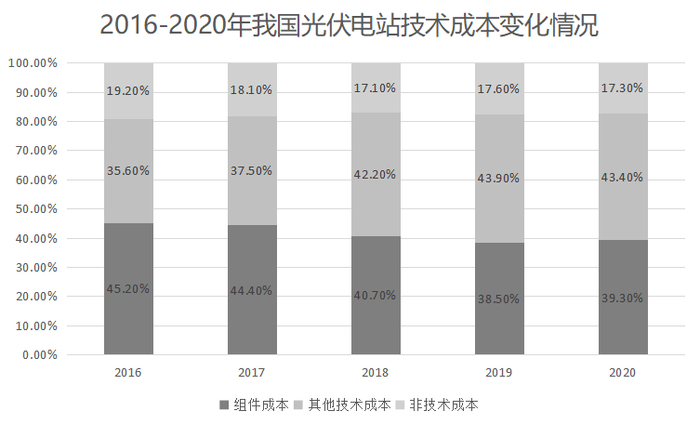 而且光伏电站投资成本持续下降的。2020年间,系统价格同比下降12.3%;非技术成本同比下降0.3个百分点;组件价格同比下降10.3%;土地费用占比同比上升1个百分点。