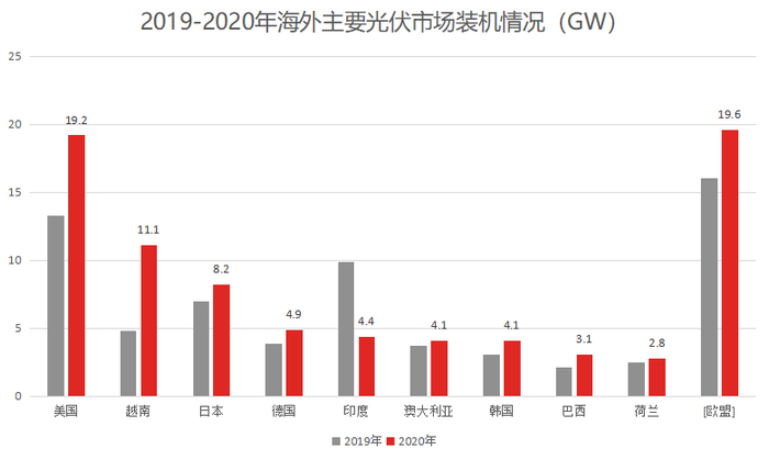 海外市场前景广阔,2020年全球光伏新增装机同比增长13%,虽然受到疫情影响,但是仍然保持了增长势头。美国保持全球第二大装机市场,越南成为第三大装机市场,印度市场受疫情影响下降明显,欧洲整体维持稳健上升。