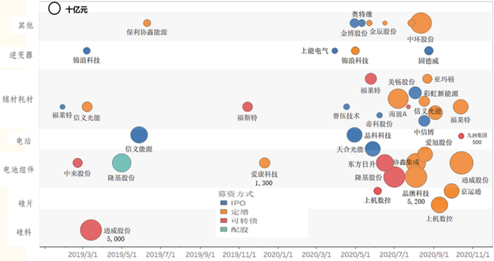 光伏行业融资规模也在持续扩大, 2019年融资规模达到180亿元,2020年上升到682亿元,2019年融资数量10项,2020年上升到33项,可见光伏行业的发展势头是非常强劲的。