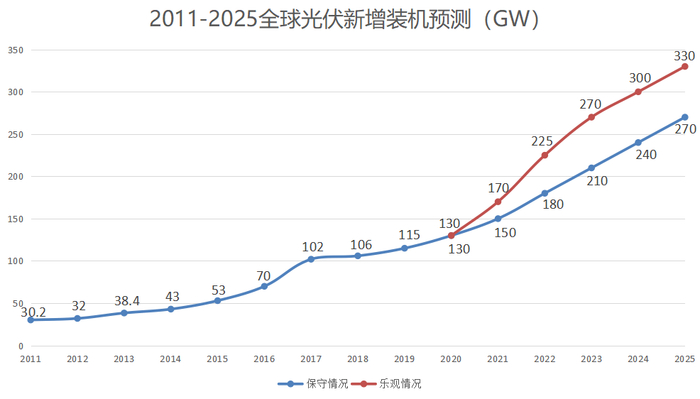 2020年全球电力需求下降2%,可再生能源发电量上升7%,可再生能源发电量上升20%。根据IEA预测的光伏市场情况,2021年全球电力需求预测上升3%,可再生能源装机量预测上升10%,光伏新增装机占可再生能源新增装机一半以上。