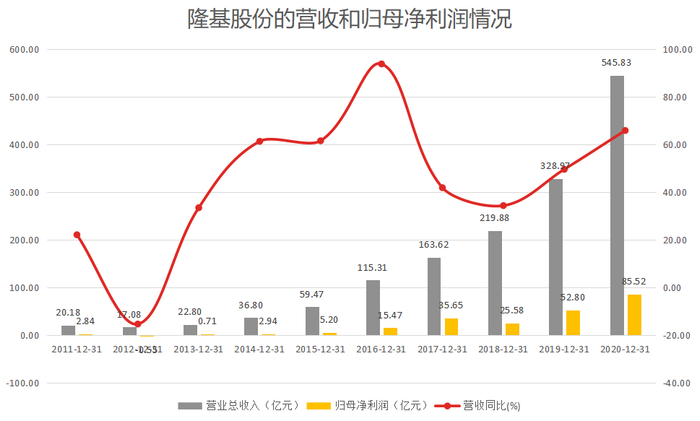 隆基光伏行业龙头,起于单晶硅棒、单晶硅片业务,通过并购进入电池/组件环节,采用纵向一体化战略,打通行业上中下游。2020年公司实现营收545.83亿元,同比增长65.92%;净利润85.52亿元,同比增长61.99%;2021年Q1实现营收158.5亿元,同比增长84.36%;归母净利润25亿元,同比增34.24%。2020年单晶硅片出货量58.15GW,硅片毛利率为30.36%;单晶组件出货量24.53GW,组件毛利率20.53%。