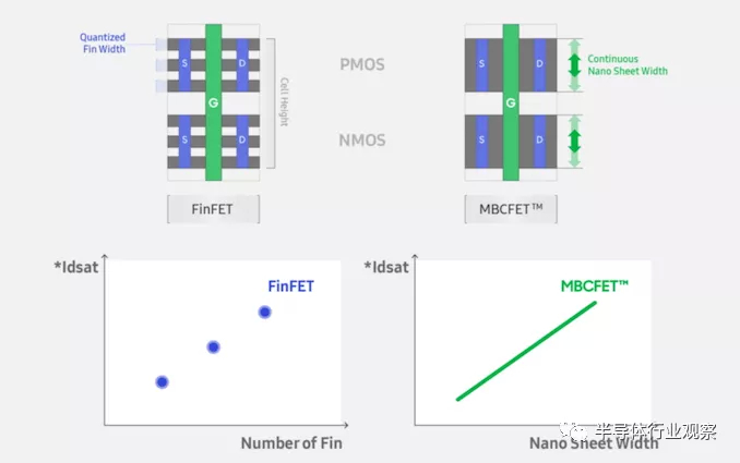 人们普遍预计,一旦标准 FinFET 失去动力,半导体制造行业将转向 GAAFET 设计。每个领先的供应商都称他们的实现方式不同(RibbonFET、MCBFET),但它们都使用相同的基本原理——具有多个层的灵活宽度晶体管帮助驱动晶体管电流。FinFET 依赖于源极/漏极的多个量化鳍片和多个鳍片轨迹的单元高度,而 GAAFET 支持可变长度的单个鳍片,从而允许在功率、性能或面积方面优化每个单独单元器件的电流。