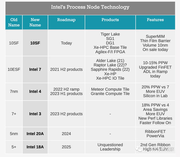 2021 H2,Intel 7:这个节点以前称为 10nm Enhanced Super Fin 或 10ESF。Alder Lake (正在批量生产)和 Sapphire Rapids 都属于这一代工艺的产品,由于晶体管优化,这代工艺的每瓦性能比 10SF 提高 10-15%。此外,英特尔的 Xe-HP 现在将被称为英特尔 7 产品。