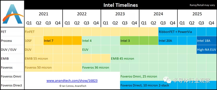 而据外媒anandtech的报道,英特尔在工艺方面也继承了过往的一些传统。如下图所示,英特尔对用于生产(production)和进入零售(retail)之间是有区别的;英特尔将某些技术称为“准备就绪”(being ready),而其他技术则称为“加速”(ramping'),因此这个时间表只是提到的那些日期。正如您想象的那样,每个工艺节点都可能存在数年,此图只是展示了英特尔在任何给定时间的领先技术。